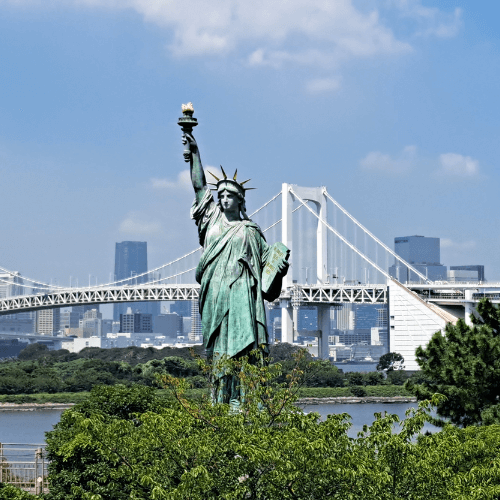 Appena arrivati, ci dirigiamo subito verso una delle attrazioni più curiose di Odaiba: la Statua della Libertà giapponese. Sebbene non sia grande come l’originale, la sua presenza è magnetica e ci trasporta con la mente dall’altra parte del mondo. La statua si staglia con lo sfondo del Rainbow Bridge, che collega l’isola artificiale di Odaiba con il centro città. È impossibile non fermarsi per qualche foto mentre ammiriamo il contrasto tra il simbolo occidentale della libertà e il panorama moderno di Tokyo.