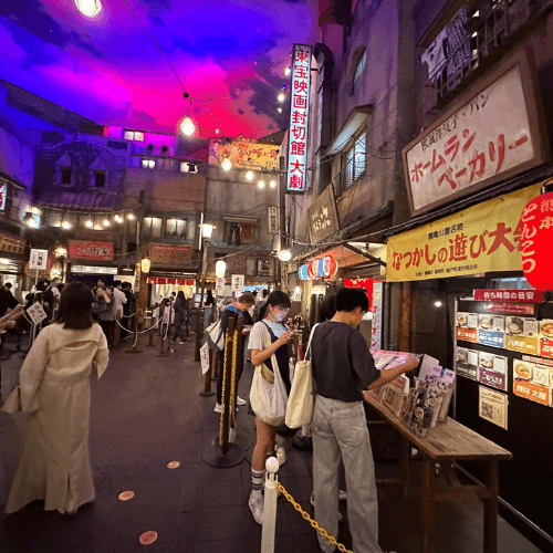 La prima tappa della giornata è stata una vera chicca per gli amanti del ramen e per chiunque apprezzi il buon cibo: il Ramen Museum. Già all’ingresso, una scultura mobile di un enorme piatto di ramen ci accoglie, facendo venire subito l’acquolina in bocca. Scendendo le scale, ci ritroviamo catapultati nel passato, in una suggestiva ricostruzione del quartiere popolare di Shitamachi. È un’atmosfera sospesa nel tempo: luci calde, insegne vintage, ristoranti dall’aspetto autentico e i profumi invitanti di brodo e noodles che riempiono l’aria.