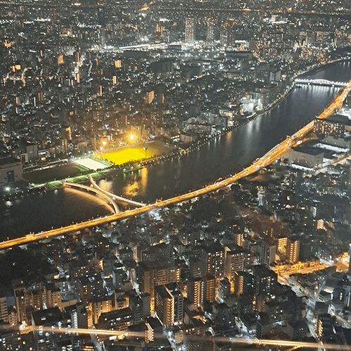 Con la luce calante, ci dirigiamo verso la nostra ultima tappa della giornata: il Tokyo Skytree. Prendiamo l’ascensore fino alla piattaforma di osservazione, dove ci si apre davanti un panorama che toglie il fiato.